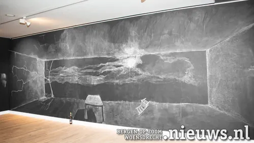 Zodra je de galerie binnenstapt zie je aan de linkerkant aan de wand krijttekening van vierentwintig vierkante meter van Jodrike en Trudie. Al lang hadden Jodrike en Trudie al het idee om wat leuks te doen met de grote zwarte zijwand van de galerie en nu is het er dus van gekomen. het kunstwerk zal een maand bestaan, waarna het met een emmer water en een spons weer voor altijd zal verdwijnen.