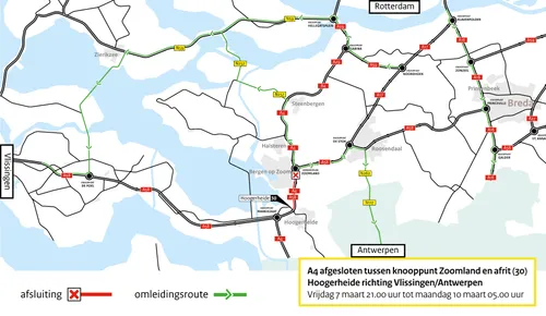 Rijkswaterstaat voert werkzaamheden uit aan de A4. Hierdoor is de A4 tussen knooppunt Zoomland en afrit (30) Hoogerheide richting Vlissingen en Antwerpen tijdelijk afgesloten voor het verkeer van vrijdag 7 maart 21.00 uur tot maandag 10 maart 05.00 uur. Alle tussenliggende op- en afritten zijn eveneens afgesloten. Weggebruikers moeten door filevorming en omleidingen rekening houden met extra reistijd die kan oplopen tot 60 minuten.