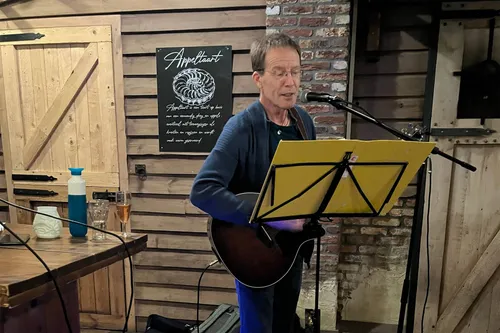 Jan Verswijveren, die ook al bij diverse openingen in Galerie Arsis optrad, zong bij deze gelegenheid drie prachtige liederen.