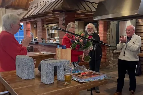 Maar ook Chistine, de vrouw van Maarten werd niet vergeten. Voor haar inzet voor de bar en andere activiteiten werd ook zij in het zonnetje gezet met een bos mooie bloemen. Met het aftreden van Maarten neemt ook Chistine afscheid van deze functie.