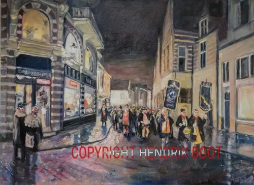 Hendrik is van het platte werk, schilderijen en aquarellen met taferelen van het feest. Hij heeft als een toeschouwer met zijn camera rondgekeken, hier en daar een pilsje gepakt, en de sfeer binnen en buiten vastgelegd. In het feestgedruis staan schilderen is lastig, dus maakt Hendrik in zijn atelier de keuzes, combinaties en beslist zo wie en wat vereeuwigd wordt. Er is elk jaar weer een kans dat iemand zich herkent of met een glimlach aan die gezellige avond in dat favoriete café.