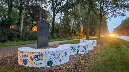 Het monument bestaat uit twee bankjes die zijn beschilderd met woorden en beelden die te maken hebben met vrede. Centraal staat een bord, met daarop de tekst die de tragedie duidelijk moet maken: